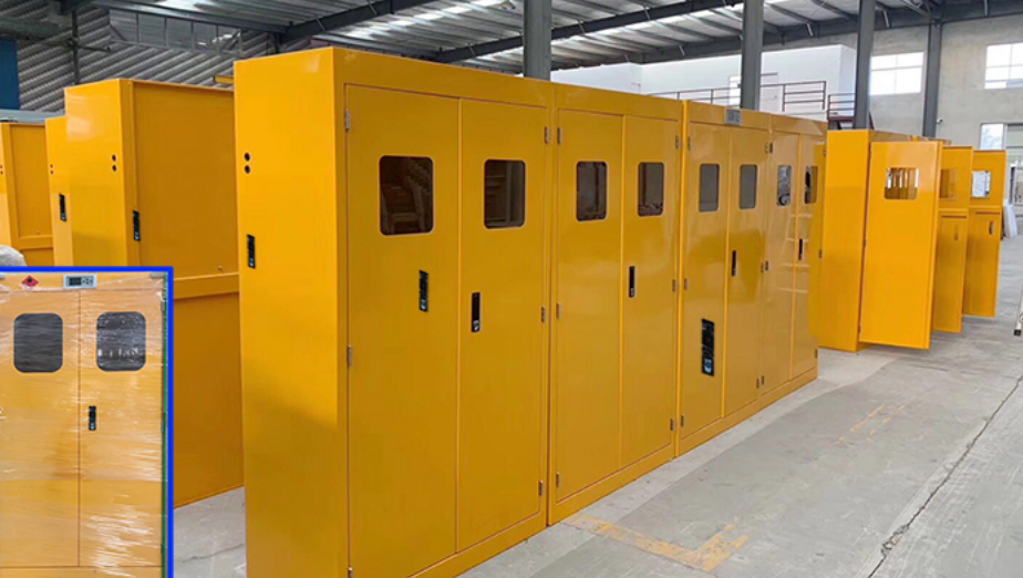 线喷涂,高温固化,柜体单层结构,气瓶柜底板带有加强筋承重力强,内置气瓶卡带+钢制气瓶垫板。